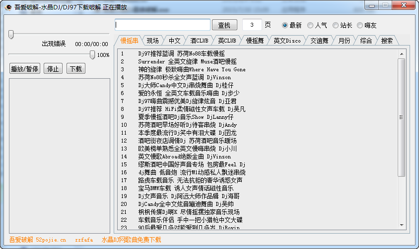平时在网上听到好听的DJ音乐想要下载好难呀,今天下载王带来这款吾爱水晶DJ/97DJ下载器,它是一款可以下载网络上最热门的DJ舞曲工具,包括慢摇串烧、现场舞曲、中文舞曲、酒吧舞曲、英文Club、英文Disco、交谊舞曲等内容,完全免费,有需要的快拿走吧! 吾爱水晶DJ/97DJ下载器怎么用 吾爱水晶DJ/97DJ下载器使用方法 1、下载后运行软件,选择需要的DJ类型 2、选中歌曲,右键下载 3、弹出的对话框选择保存。 4、选择保存位置即可。