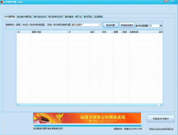 红苹果IP代理是一款功能非常强大的IP代理软件,没有任何使用限制,是一款免费的软件。本软件具有24小时不间断获取可用代理、上万IP数据自动同步等特点。有了红苹果IP代理,再也不需要到处寻找代理IP了。 红苹果IP代理软件V5.4.6 功能介绍: 1、24小时不间断获取最新全世界可用代理,上万IP数据自动同步,代理数据每日更新。 2、软件启动时自动下载并更新为最新的代理IP数据库。 3、国内国外代理IP地址自动识别,显示代理IP地址是透明代理还是匿名代理,让你一目了然。 4、一键变更系统IP,一键取消代理IP,简单点击立即生效。 5、软件具有自动换IP刷站功能:针对网站站长、个人博客、网络写手、网站推广、网络营销、网店推广等各类网络从业人员,用于提高网站流量,店铺/商品浏览量,网页PV(访问量),UV(独立访客),IP(独立IP)量,可自行设置更换IP时间间隔。 6、软件具有自动投票功能,支持换IP自动投票和单一IP自动投票,支持投票网站图形验证码自动识别,满足对投票功能有需求的用户。 7、软件具有换IP自动点击功能,用户可自行设置更换IP时间间隔。 8、进行自动更换IP操作时,不影响本机对互联网的访问速度。