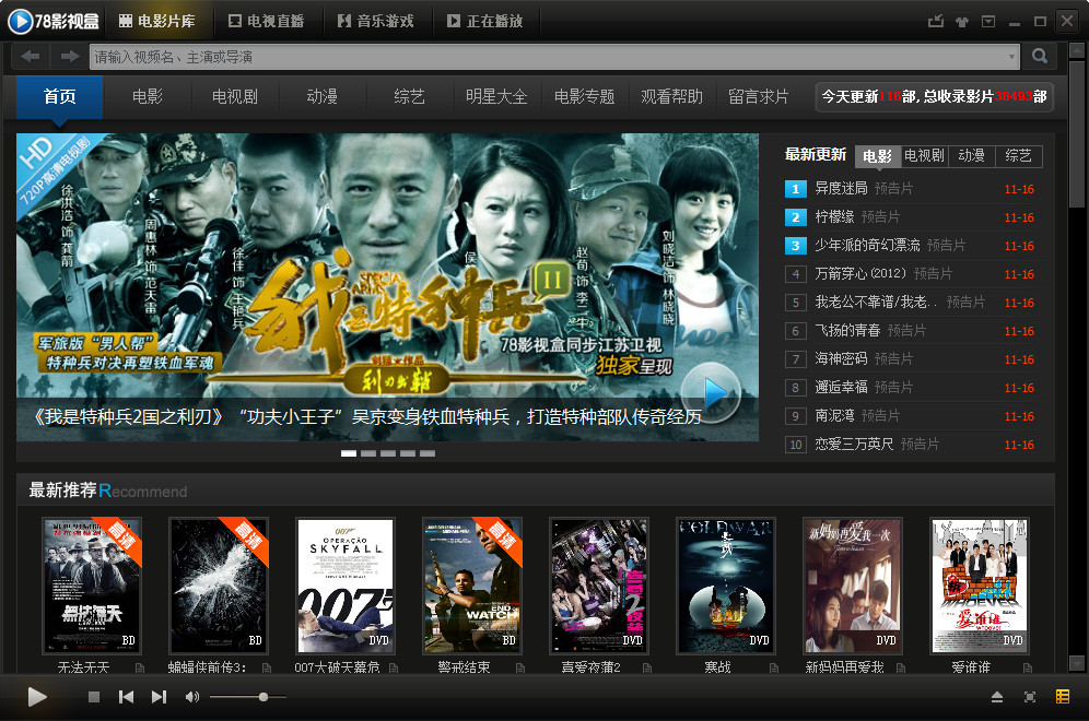 78影视盒是一款功能强大、资源丰富的高清电影播放器,影视内容更新及时,实现与电视节目同步更新,目前已经汇聚了上万部高清电影、电视剧、动画、美女写真等,全部DVD画质音效,随点随看,时间自由掌握,具有的资源占用低、操作简捷、越多人看越流畅、完全免费等功能,支持数百家直播网络电视台,可收看NBA、足球直播赛事,最新的综艺影视节目,是您看影视装机必备工具。