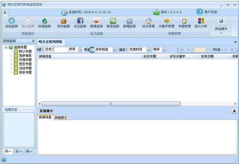 哨兵舆情监测系统提供多种舆情监测功能、网站跟踪、论坛跟贴、全网监测、分析统计与报表输出。无遗漏地满足了目前互联网信息监测所必需的作业模式。提供有专业的情报管理、编辑与简报生成功能,让您在处理繁杂的情报时也能得心应手。